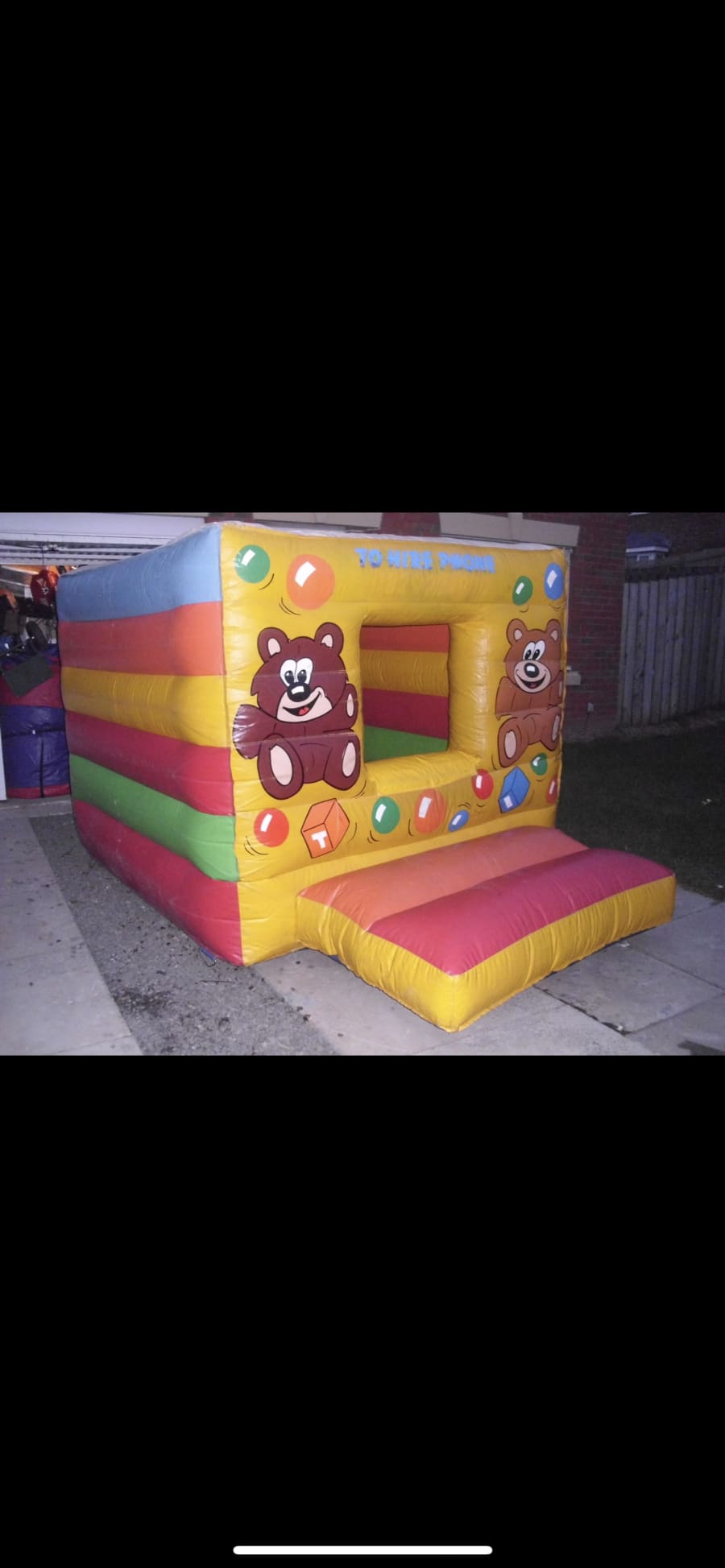 A Multi-coloured bouncy castle suitable for use indoors and out, but only by users of a younger generation