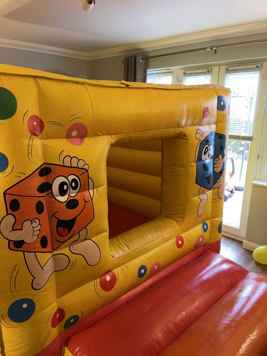 A Multi-coloured bouncy castle suitable for use indoors and out, but only by users of a younger generation